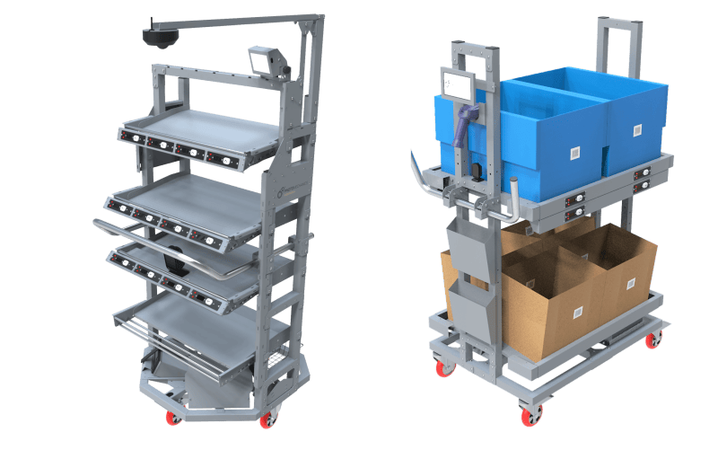 - The multi-order picking cart features uniquely shaped wheels, arranged in a rhombus, for superior maneuverability;